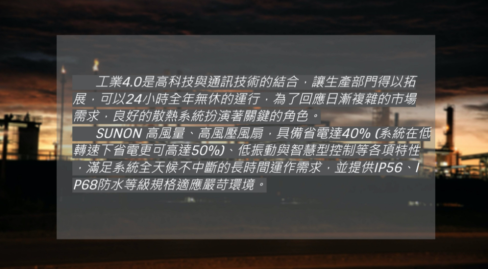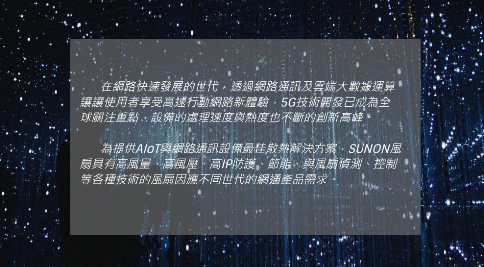 成立於民國80年,本公司為建準電機工業(SUNON DC/AC Fan —www.sunon.com)台灣代理商,包含風扇、散熱模組、Heat sink、通風與空氣淨化解決方案領域,產品應用於5G設備、IOT、醫療、家電、電競、汽車、工業、冷凍冷藏設備、監控服務、可擕式產品和綠建築通風等產業。